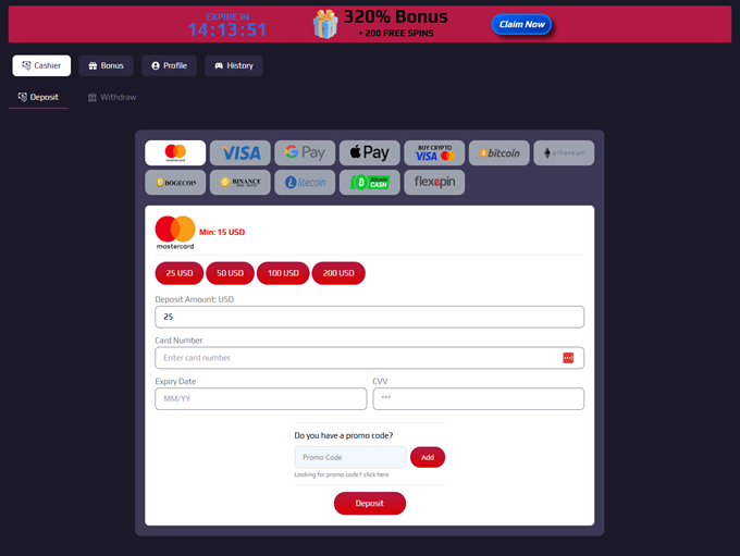 - Deposit Options: Crypto (BTC, ETH, LTC, BCH), Apple Pay, Google Pay, crypto via credit card