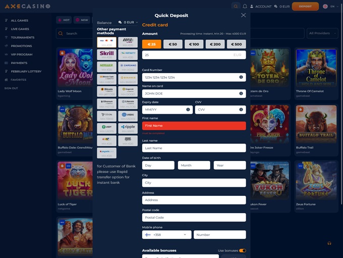 With 30+ deposit and 25+ withdrawal methods, AxeCasino makes banking simple. Crypto is a major highlight, alongside traditional options like Visa, Mastercard, Skrill, Neteller, Interac, and Bank Transfers.