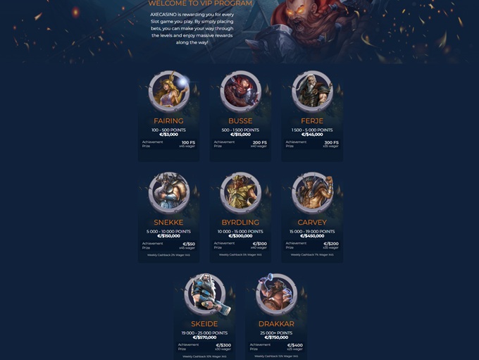 The multi-tier VIP program offers escalating benefits such as cashback, higher withdrawal limits, birthday gifts, and exclusive tournaments. Points are earned through consistent gameplay and can be exchanged for bonuses. The more you play the higher level you will be. There are 8 levels which is very appealing and motivating for AxeCasino loyal customers.