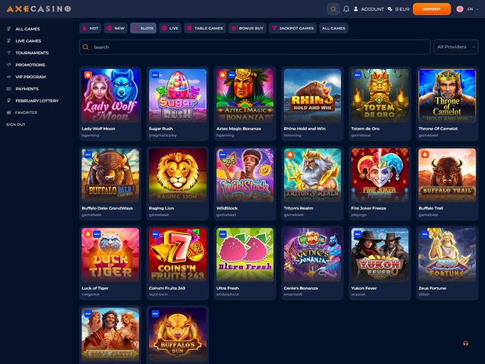 From classic slots and jackpots to poker, live roulette, and casual games—AxeCasino boasts a monstrous collection of over 8,400 titles from top providers like NetEnt, Play'n GO, Evolution, Pragmatic Play, and Yggdrasil. This includes 554 live games and 891 jackpot titles.