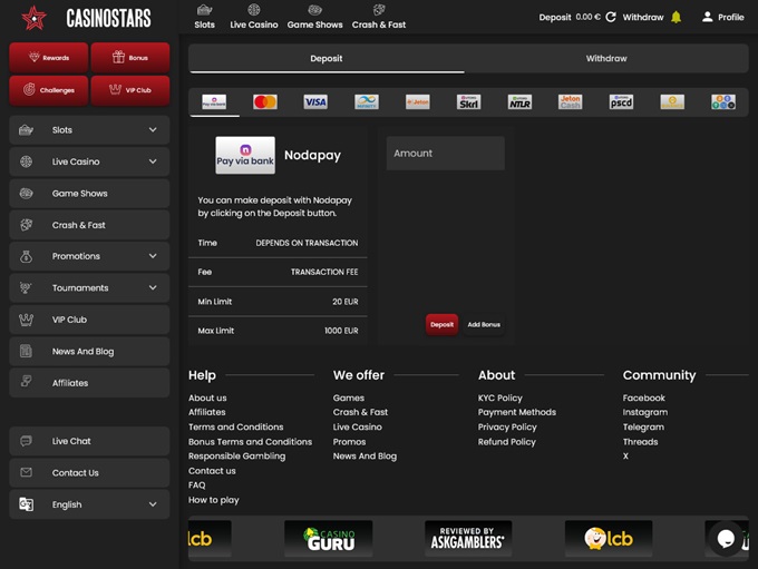 CasinoStars offers 40+ deposit/withdrawal methods, including: