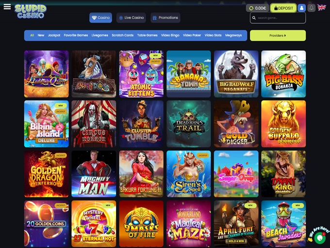 Stupid Casino features thousands of titles (listed as 8,000+ from dozens of providers such as Endorphina, Evoplay, Evolution,Felt, Gaming Foxium,Fazi, Fugaso.