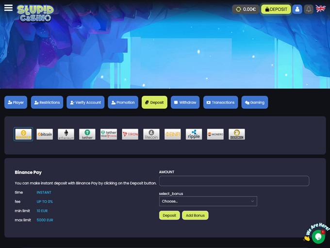 Stupid Casino provides responsible gaming tools such as deposit limits and self‑exclusion.